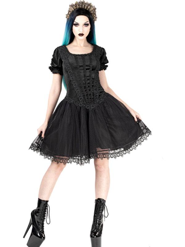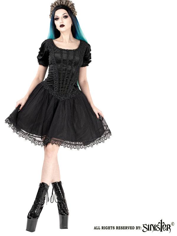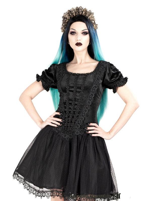 Dress with scoop neckline and elasticed puff sleeves trimmed with black Venetian lace. The fully lined skirt is made of black soft, black dotted tulle which is trimmed with Venetian lace along the hem of the skirt. The minidress has a zipper at the back.