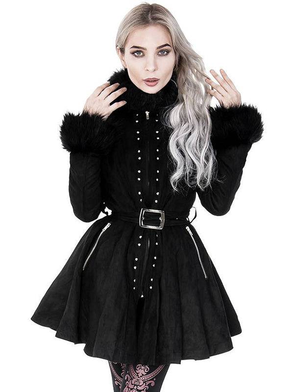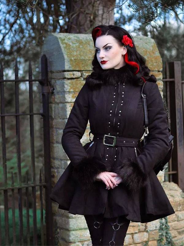 A gothic coat fastened with a concealed zipper, making it look elegant and stylish. Additionally, the coat is decorated with tiny, metal spikes. Zipped pockets will keep your hands warm.