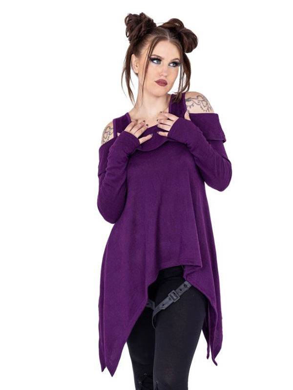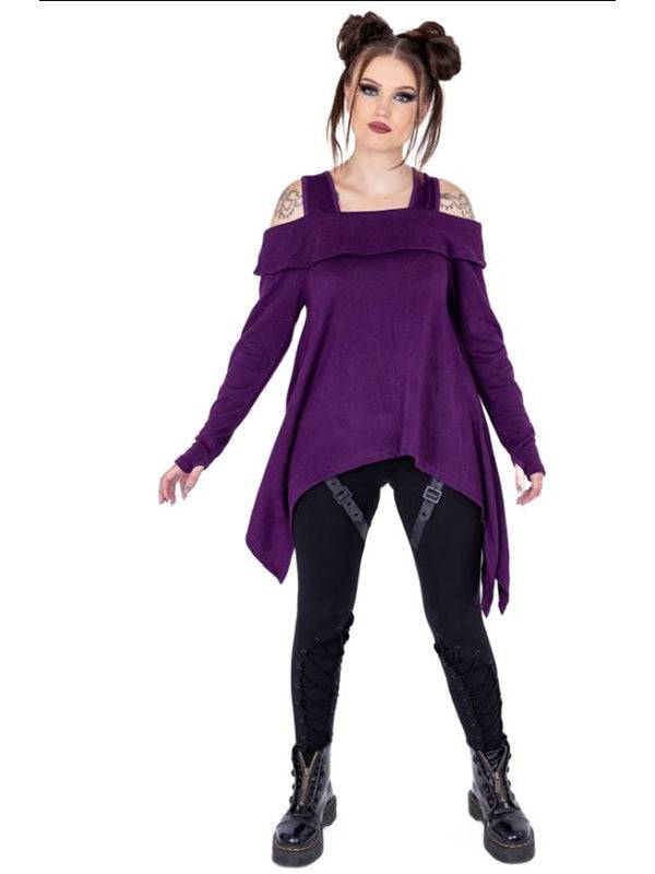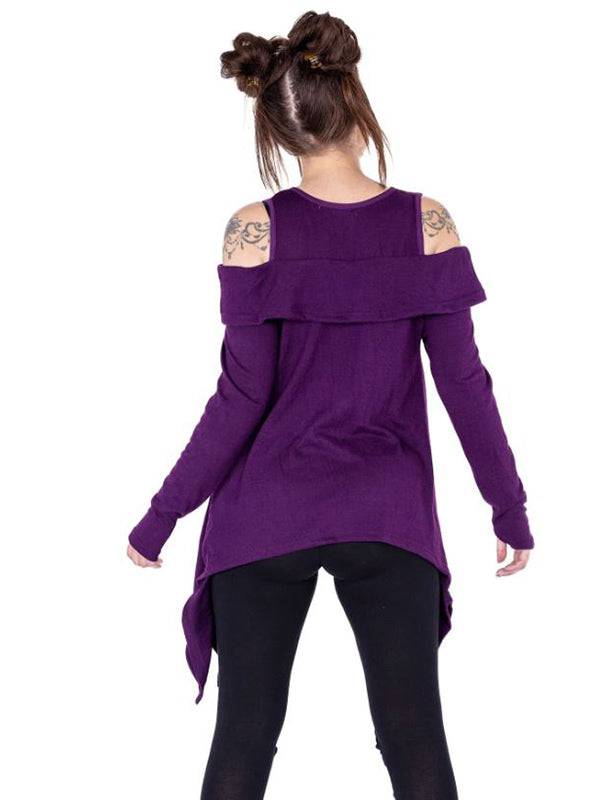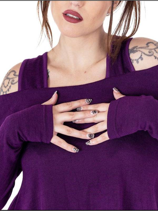 Purple Off-Shoulder Top with Extra Long Sleeves and Thumb Holes - 100% Polyester Knit