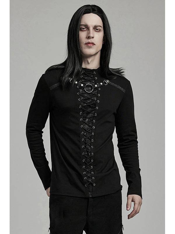 Fitted Long-Sleeve Design. Faux Leather Accents Covered with Black Mesh. O-Ring Detail. Laced Front Design. High Neckline. Made from 95% cotton and 5% elastane for comfort and flexibility.