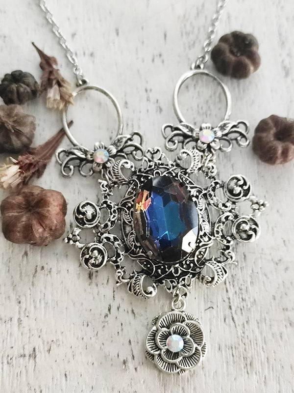 A silver fairy style necklace holding an oval cathedral 18×25 gem.