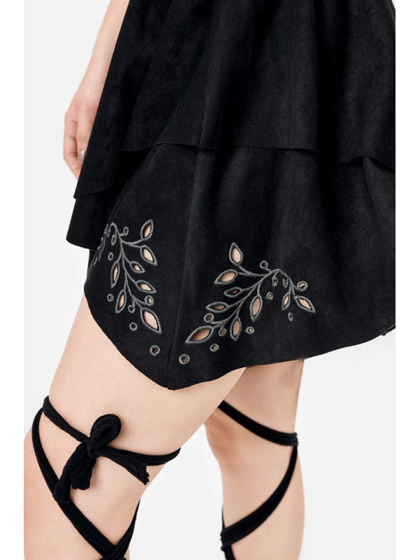 Embroidery featured at the center front and side seams, with a total of 5 delicate designs. Detachable belt with metal eyelets and a crescent buckle.