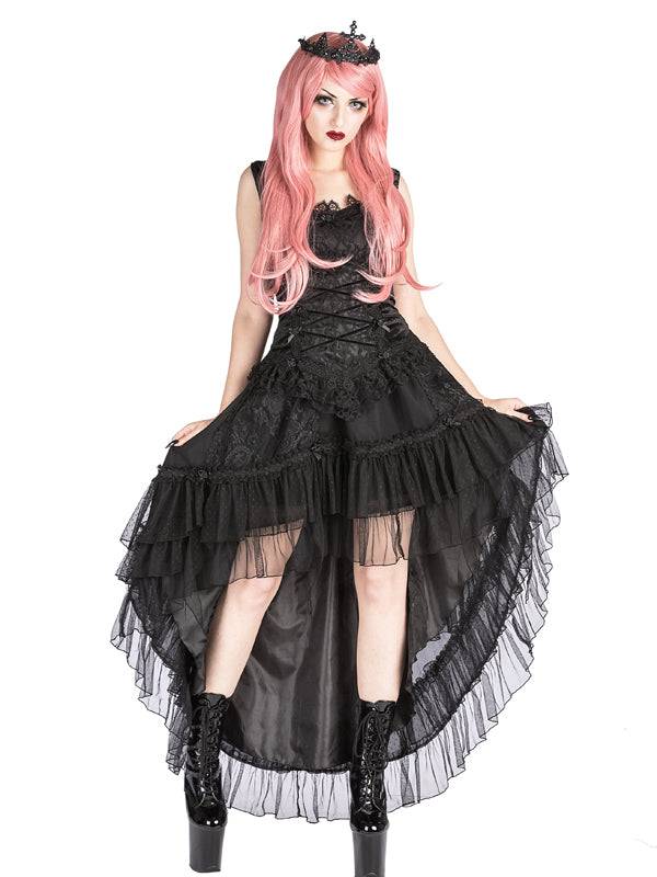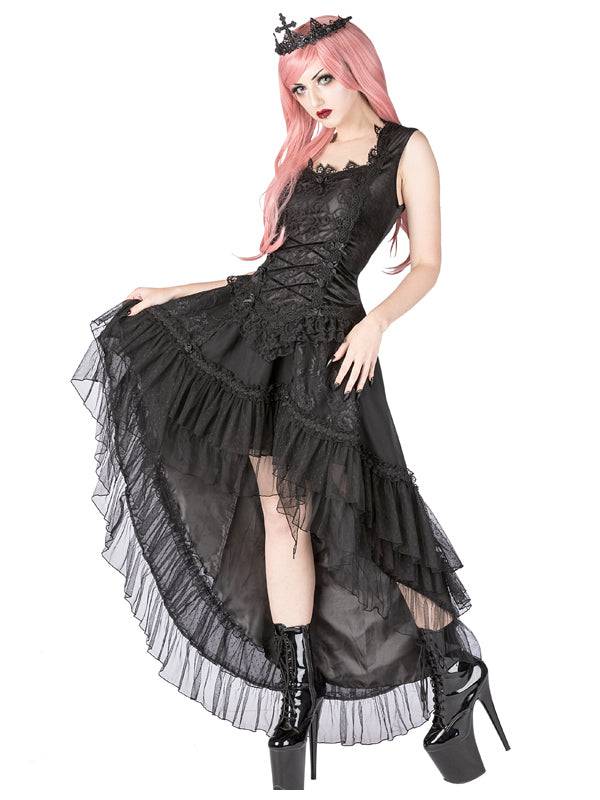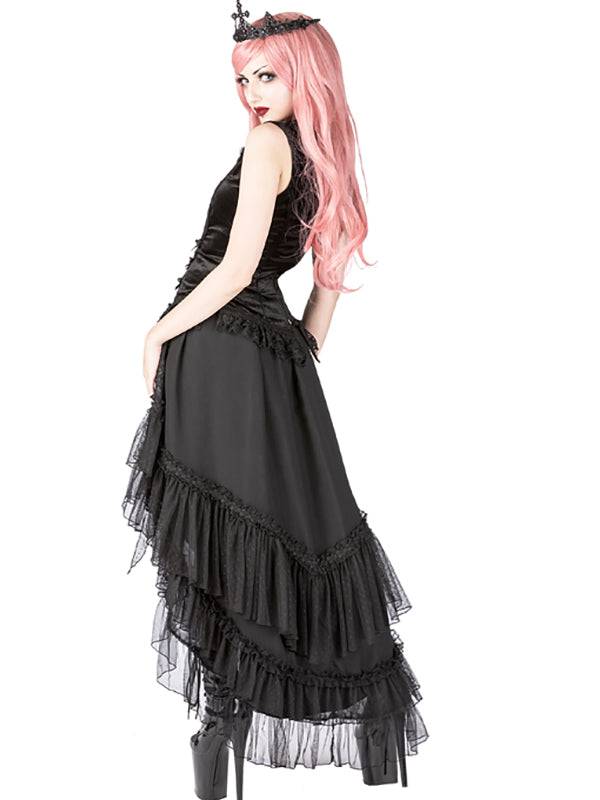 High low skirt with a double ruffle in soft mesh and a soft silky satin underskirt. The sides of the black chiffon skirt are overlaid with French lace and trimmed with venetian lace ribbon. Elasticized waistband with invisible side zipper for a perfect fit.