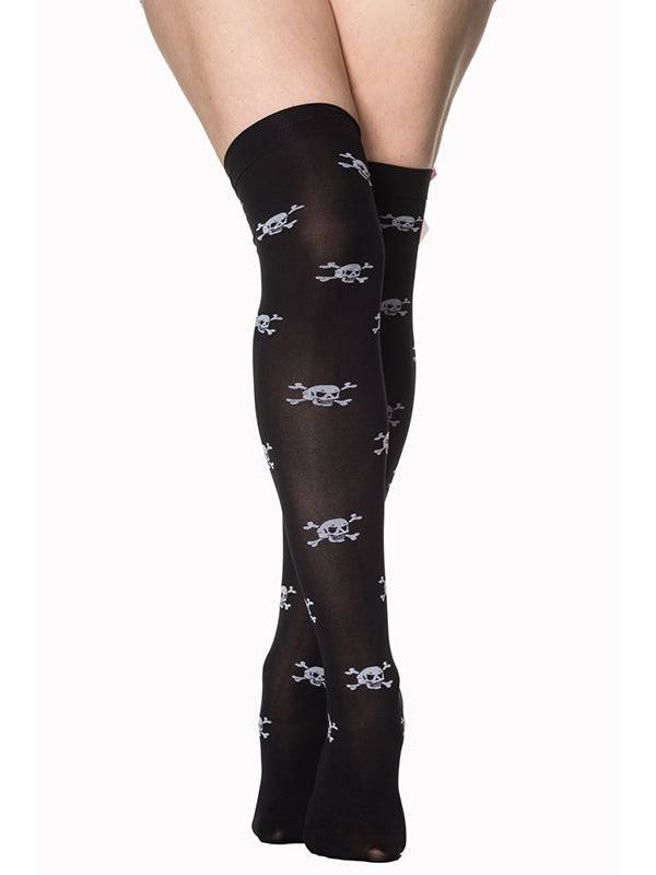 Banned Marlowe Stockings With Skull Prints And Bows - 88% Nylon, 12% Spandex - In stock is backordered and will ship as soon as it is back in stock.