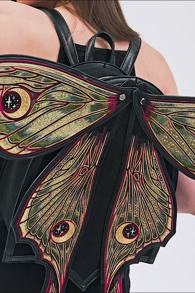 This structured, shield-shaped Metamorphosis backpack showcases fully embroidered wings with multicolored thread gradients, capturing the intricate beauty of a real moth.