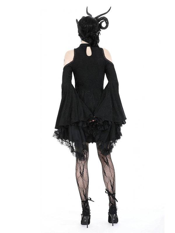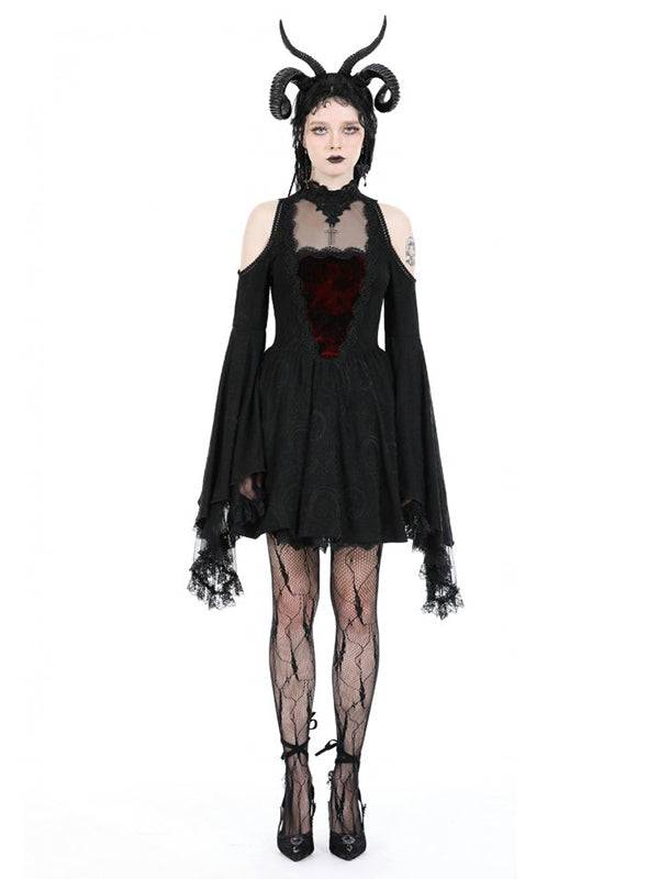 Elegant dress with lace, with wide, long sleeves and open shoulders. It features an attractive black colour with red fabric on the chest. With a side zipper for easy wear. 100% polyester.