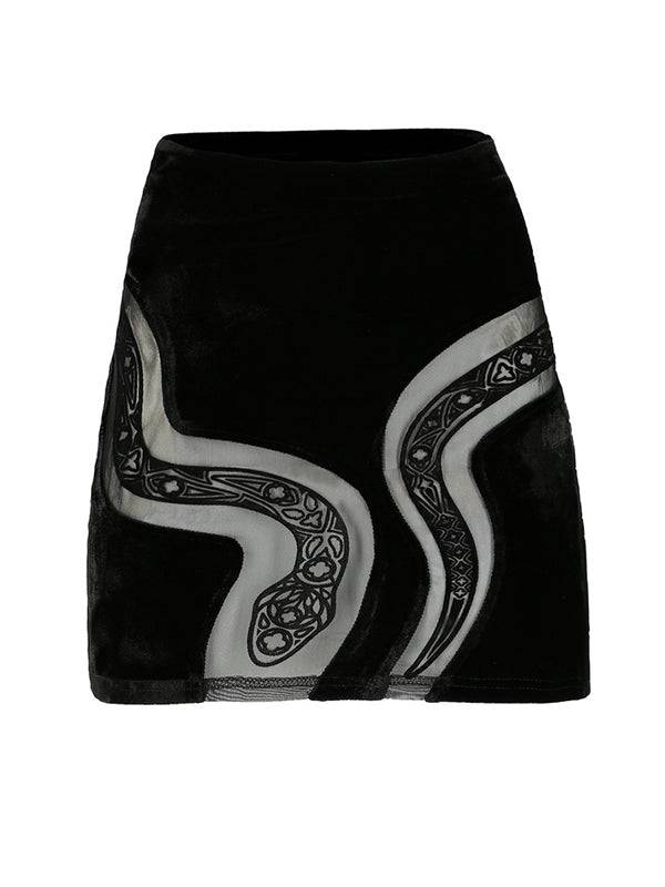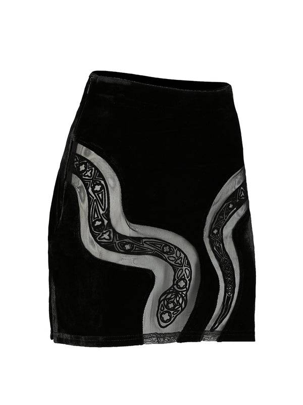 Mini skirt adorned with a snake motif. Mesh serpent intricately woven in a cathedral pattern. Crafted from a distinctive blend of velvet and mesh.