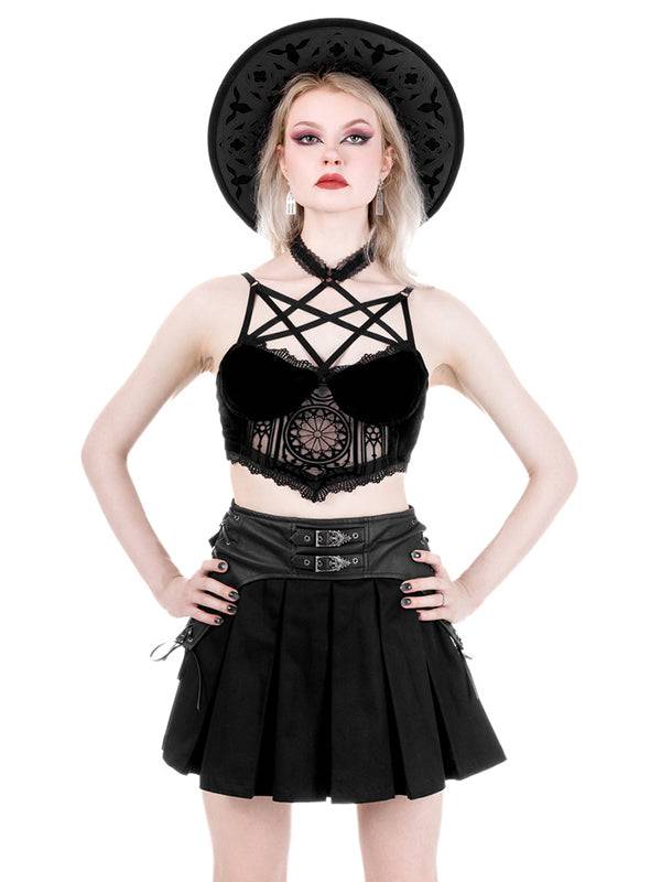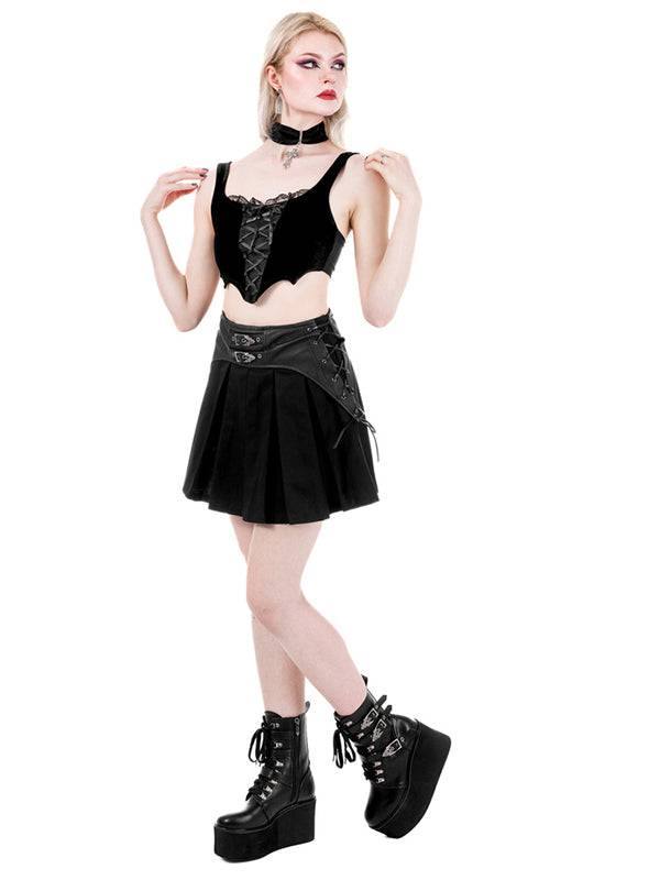 High-waisted A-line skirt with a flared hem. Contrast PU leather waistband. Two silver cathedral buckles with metal eyelets and PU leather straps. Lace-up side panels featuring metal eyelets and PU leather cords. Pleats around the full circumference. Center back zip.
