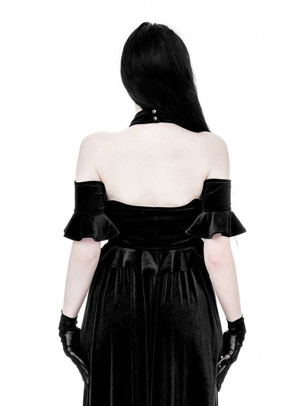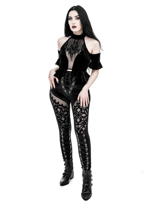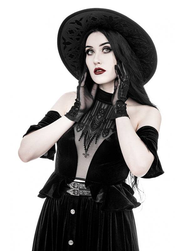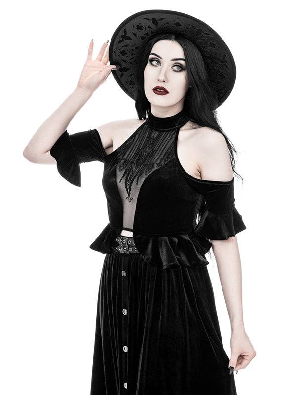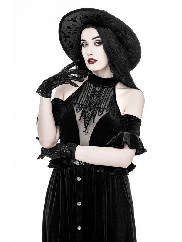 Halterneck top made from a stretchy luxurious velvet with mesh panel with inverted cathedral pattern. Flare hem exaggerats your curves. Ruffle cuffs and 3/4 sleeves. Concealed side zip. Snap fastening to back collar with two snaps.