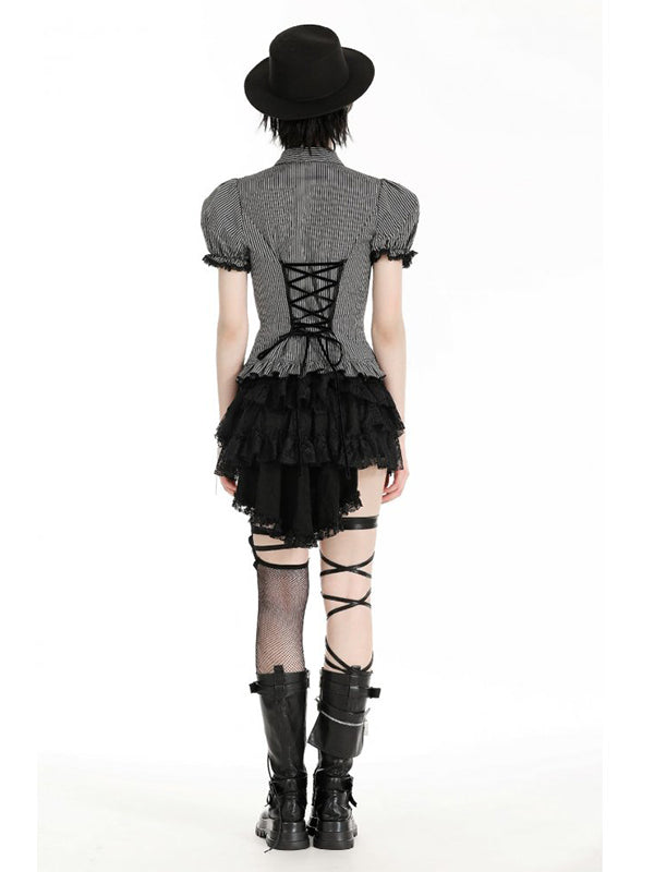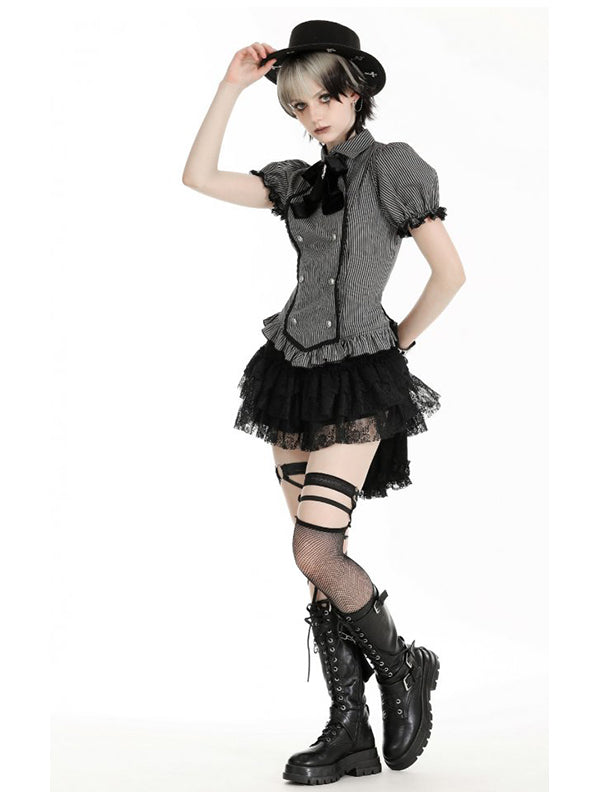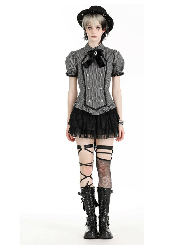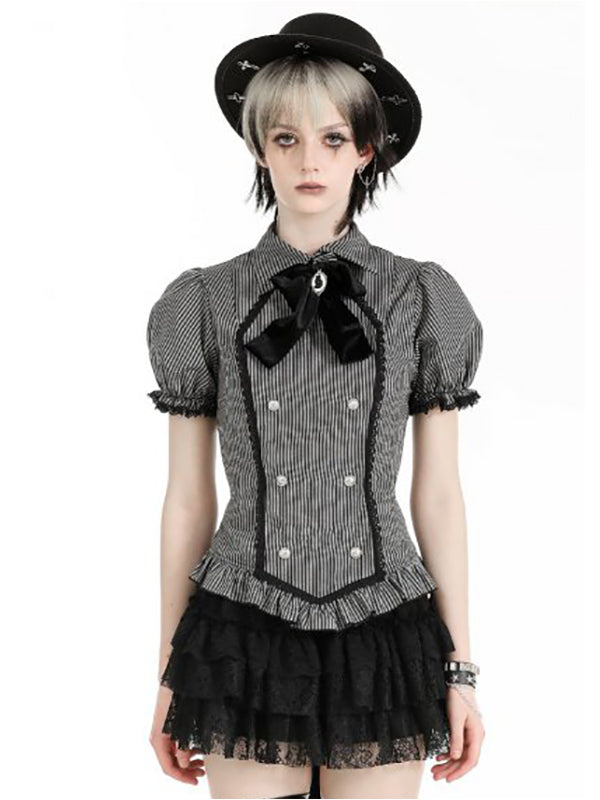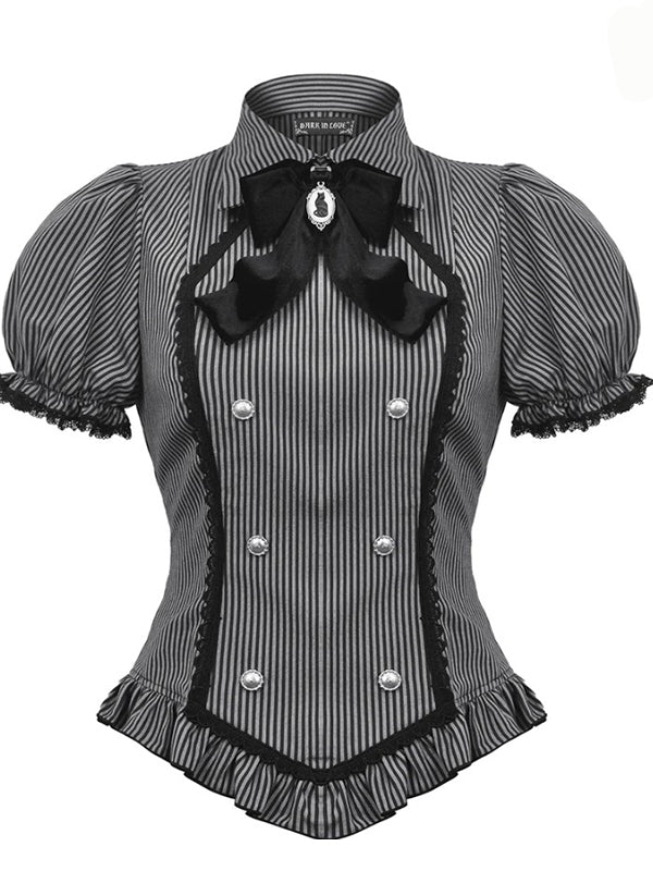 Black and grey striped blouse with puffy sleeves. Adorned with a black velvet neck bow with a cat cameo pendant. Screw buttons on the front. Lace-up back. 65% Polyester 35% Cotton
