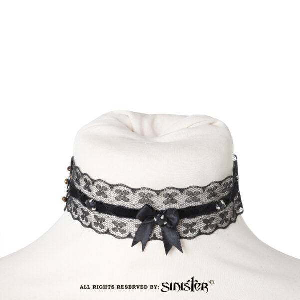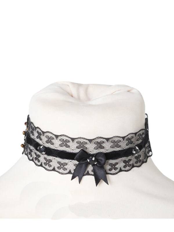 Velvet and lace choker decorated with black stones and bow.