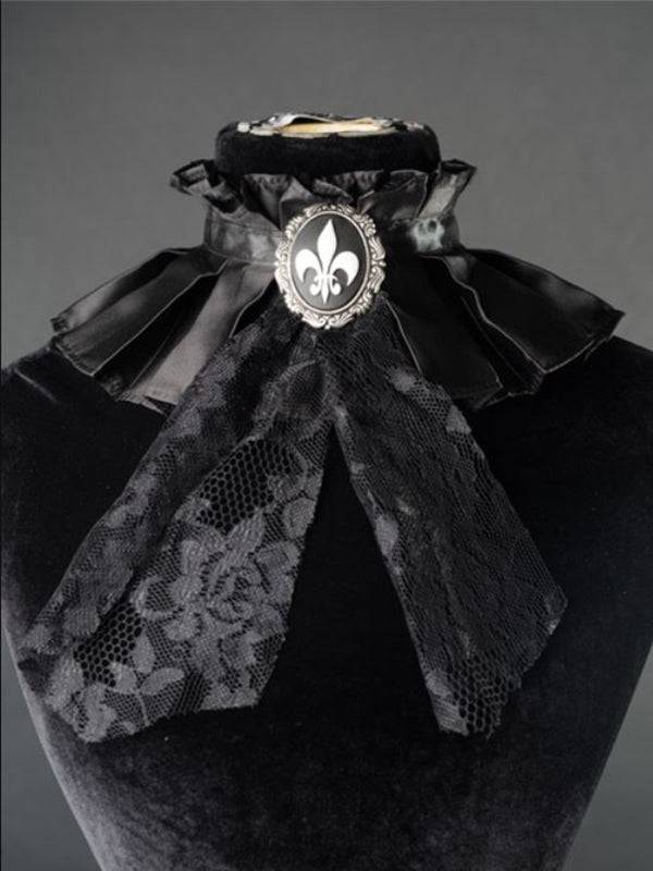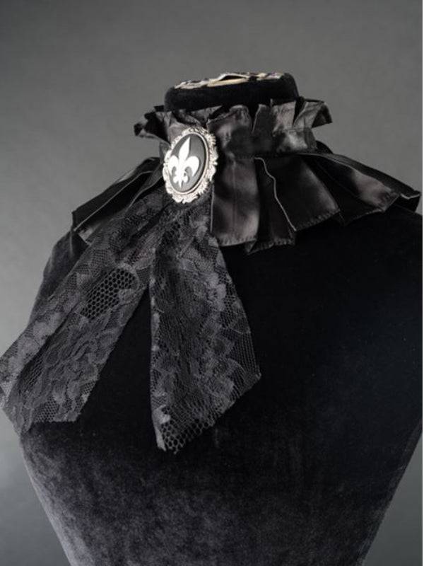 Choker adorned with soft black lace with black satin panels. Adjustable Fit. BROOCH NOT INCLUDED.