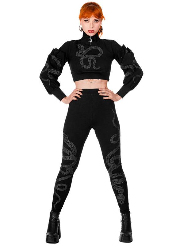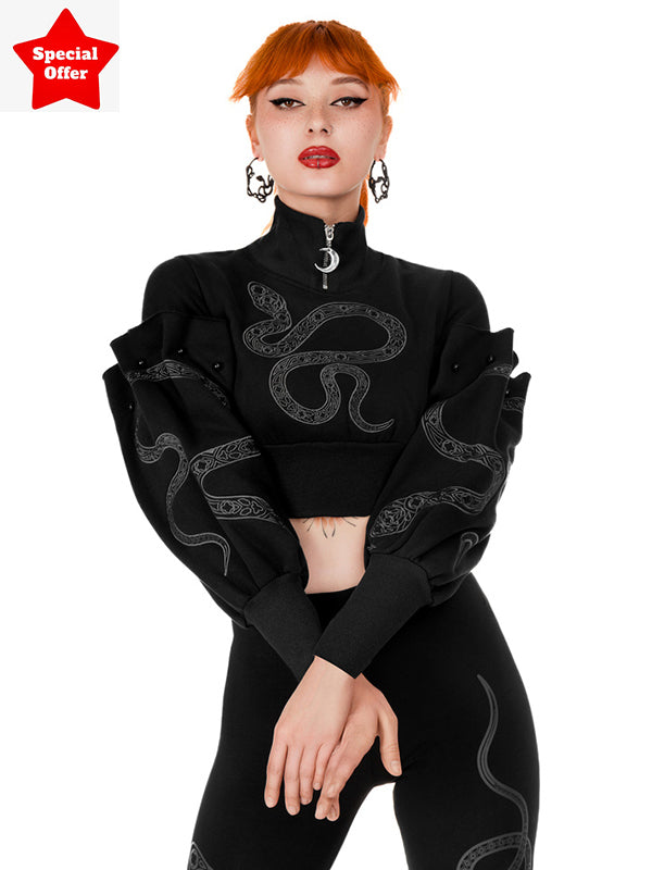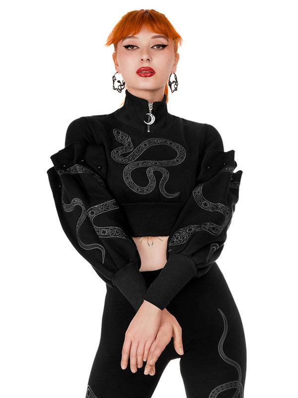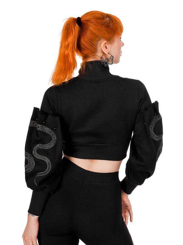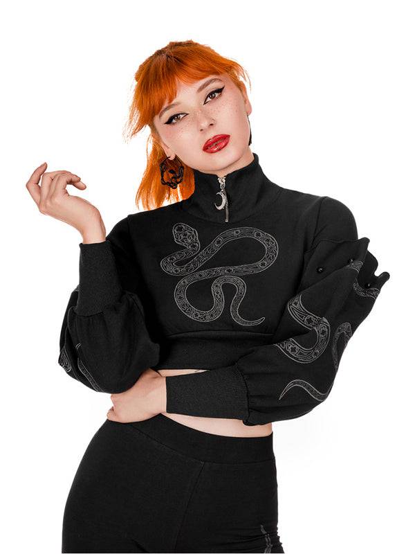 This unique sweatshirt has a short cut, which pairs perfectly with high-waisted pants. Gathered, balloon sleeves finished with delicate ruffles and black pearls. Embroideries depicting a winding snake filled with cathedral motifs. Pair it with snake-themed accessories. 100% cotton with warm fleece lining inside.