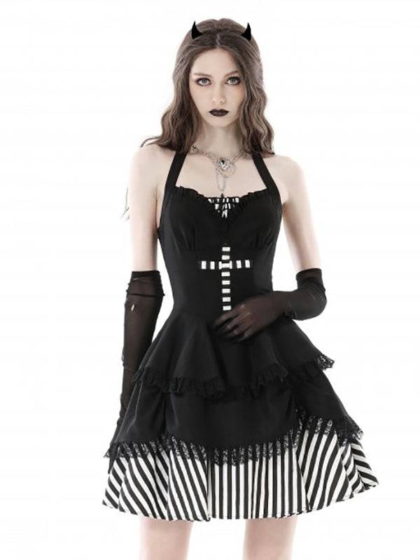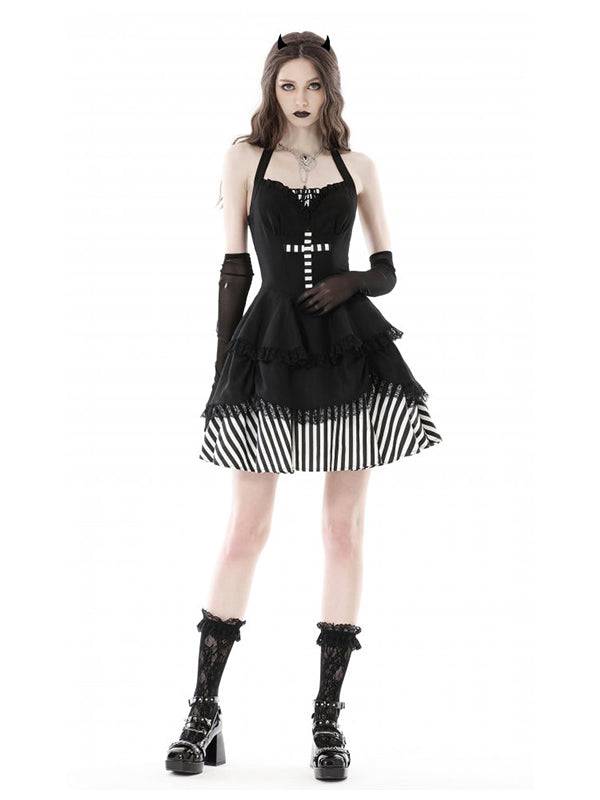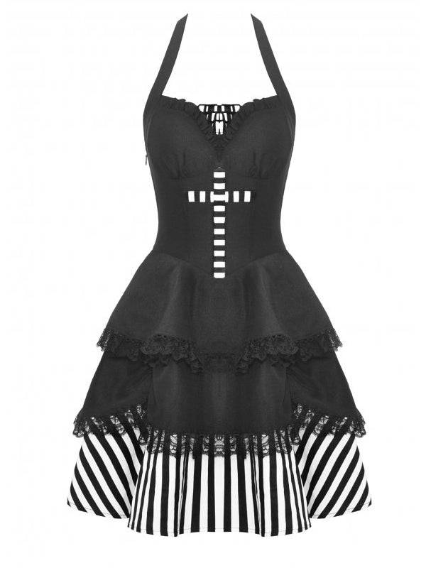 Halter dress with black and white stripes, cross, lacing at the back and bow behind the neck.