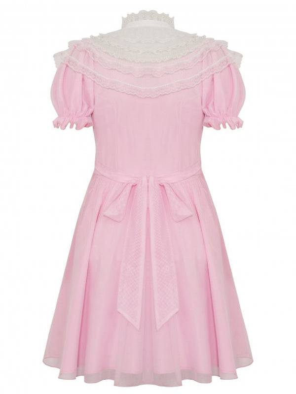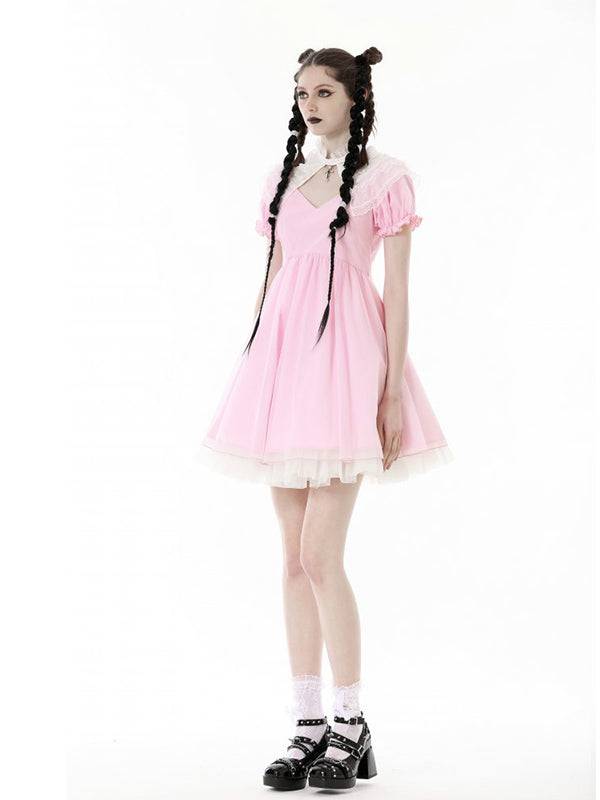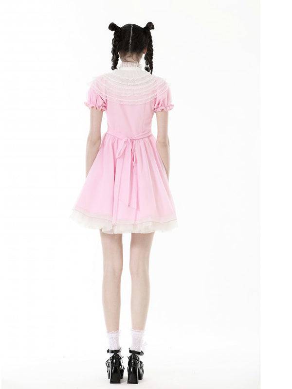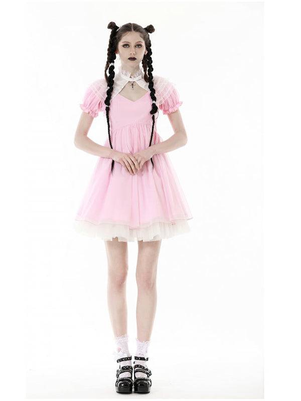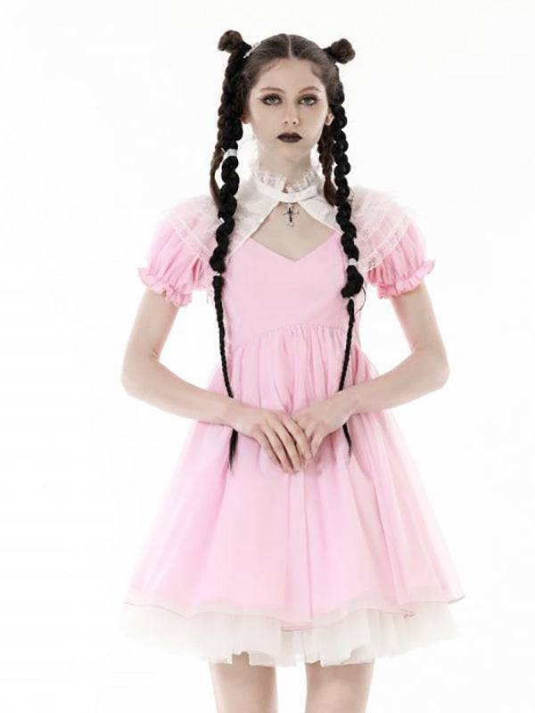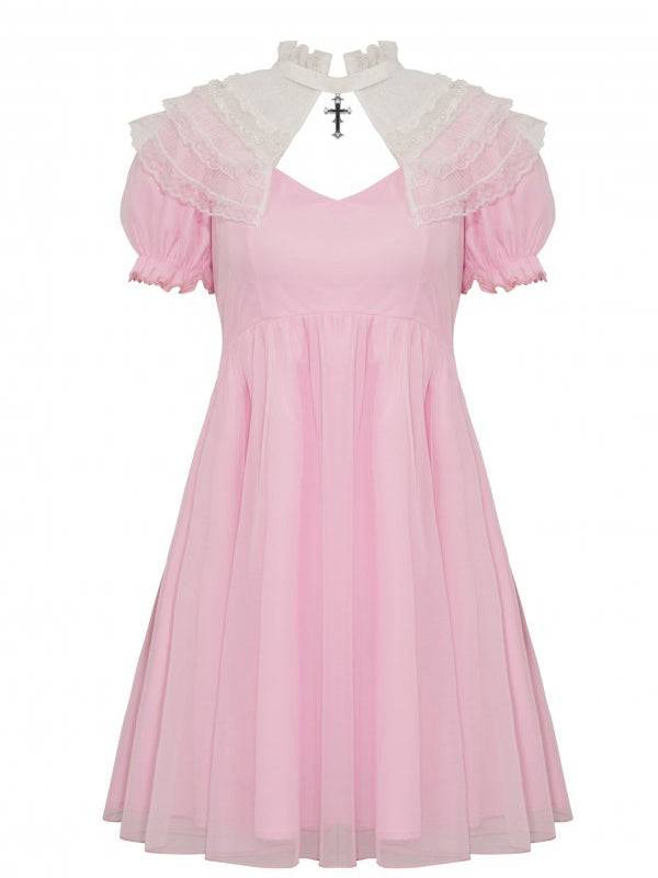 Pink dress with short puff sleeves. Detachable collar with cross, ruffle and pearl embellishments. Zipper closure.
