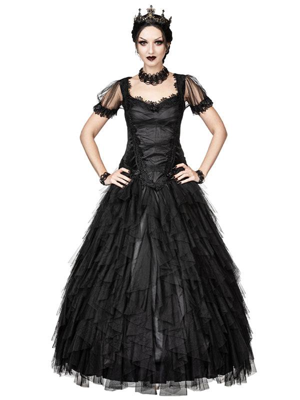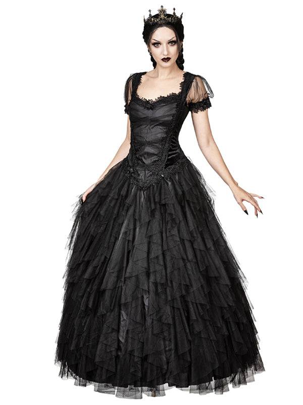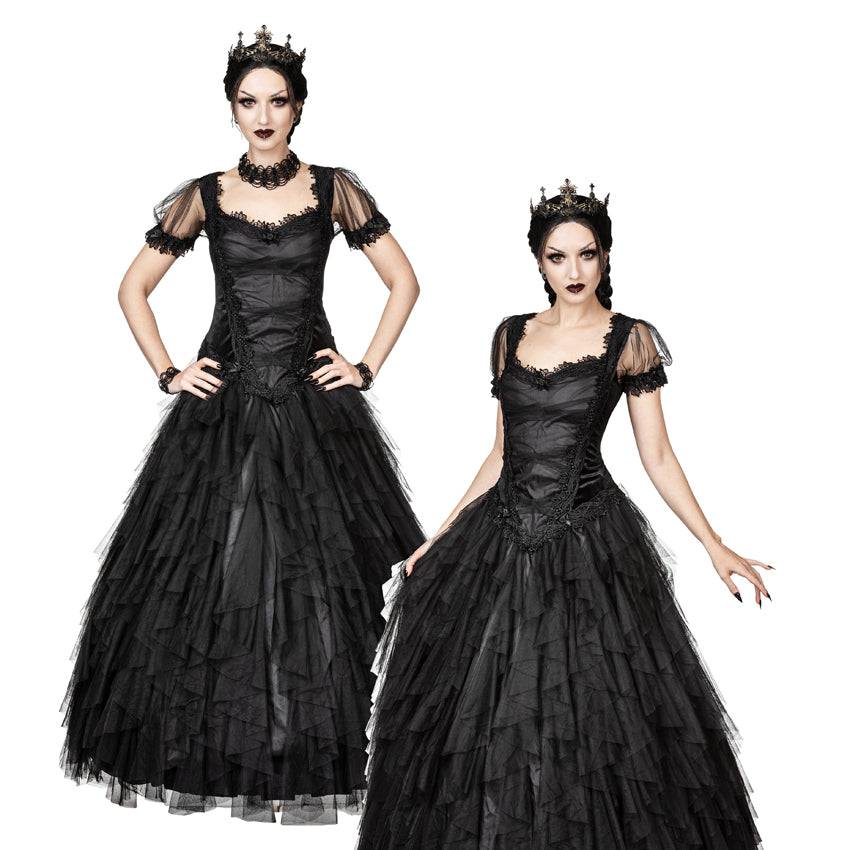 Romantic Victorian longdress with a sweetheart neckline and mesh elasticized puffed sleeves. Front made of satin and lace. Black satin ribbon bows decorated with rosebuds are adorned on the top and sleeves. The light flowing skirt of the dress consists of two layers: The top layer of the skirt is made of soft black mesh with multiple broad tiers of soft black lace for a full effect. The skirt is fully lined with black silky soft satin. Concealed zipper fastening at the back. On the picture the dress is worn with a crinoline for a dramatic effect.