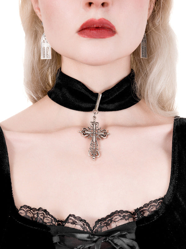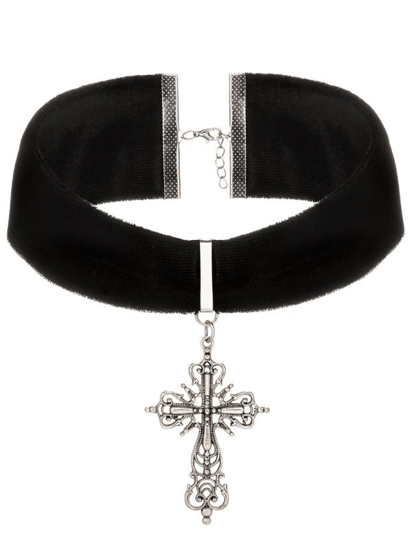 The black velour choker, adorned with an elegantly detailed cross pendant, is a must-have accessory for any goth!