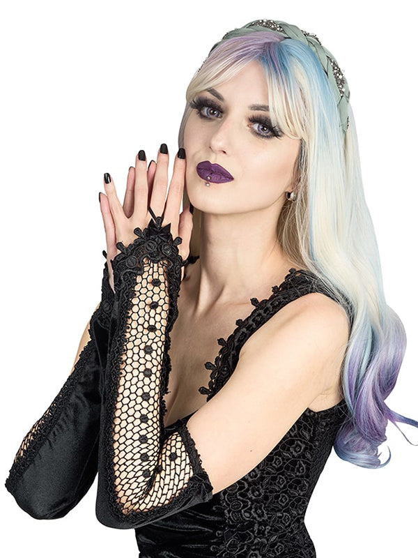 Long black gloves with finger loop and a net tulle insert with black dots. Slightly elastic for a perfect fit. Sold as a pair.