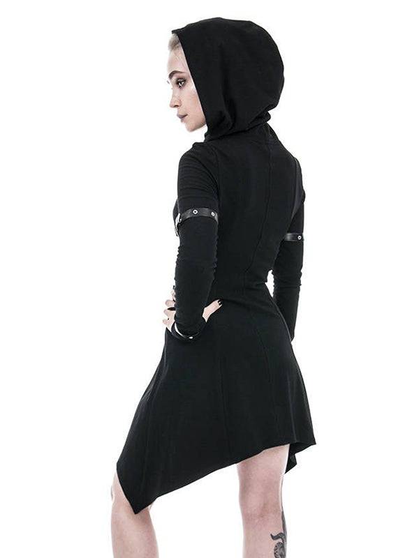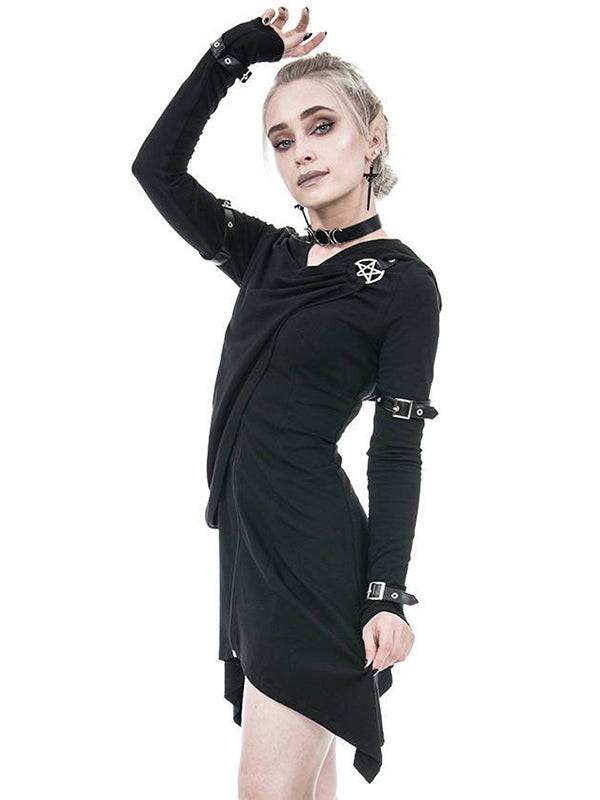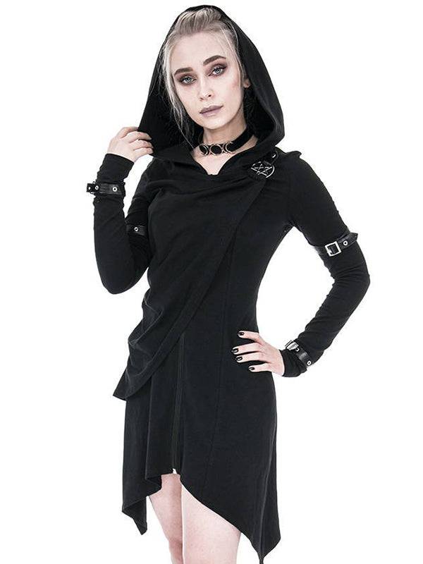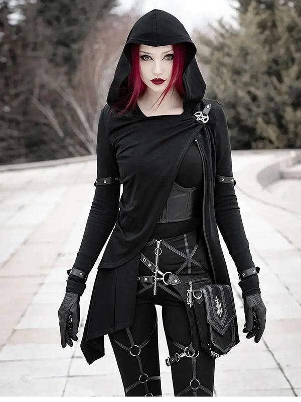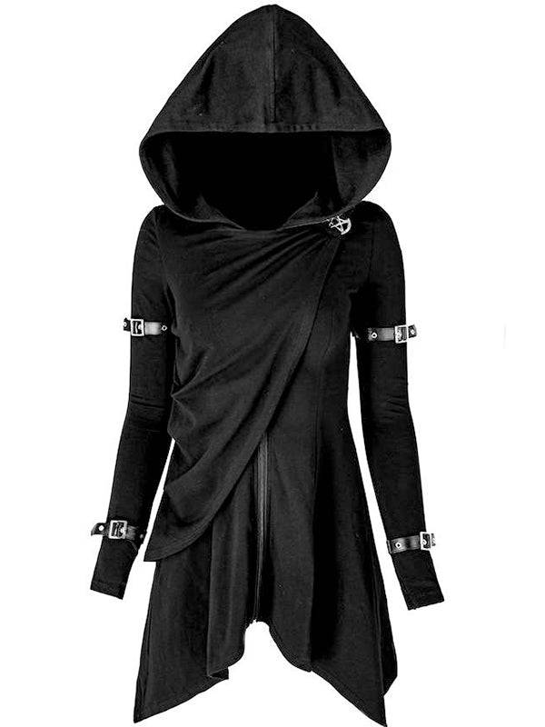 Hoodie 100% cotton with leather straps on the sleeves and a pentagram clasp. The draped draped hoodie has an asymmetrical cut - flared at the hips and fitted at the waist. Practical hood. The hoodie is fastened at the front with a zipper, which is hidden under the draped material. You can put your hands in the side pockets. Wear it with leggings.