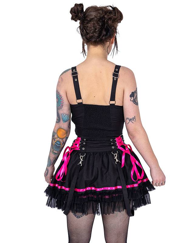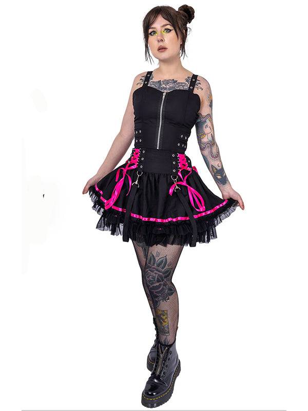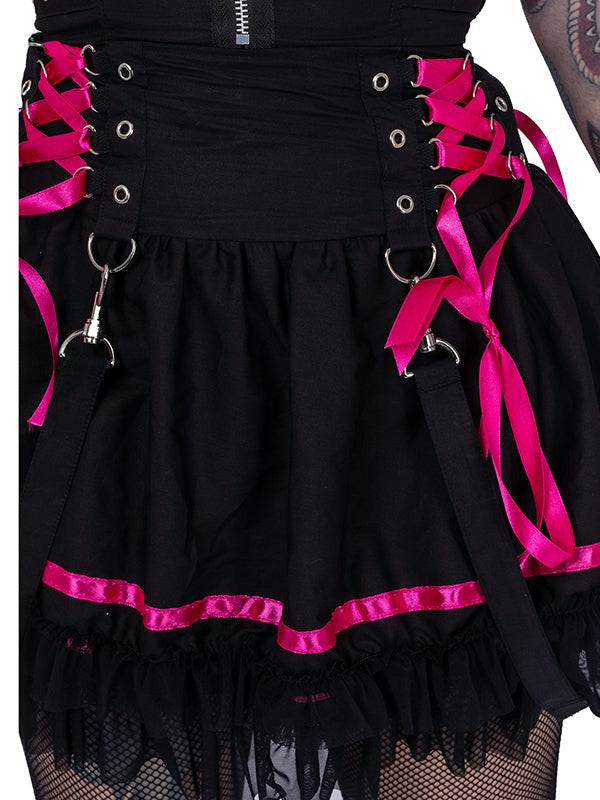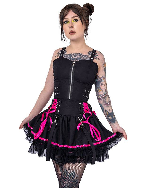 Black dress with adjustable shoulder straps. Zip corset top. Metal rings and detachable straps. Skirt with neon pink ribbons.