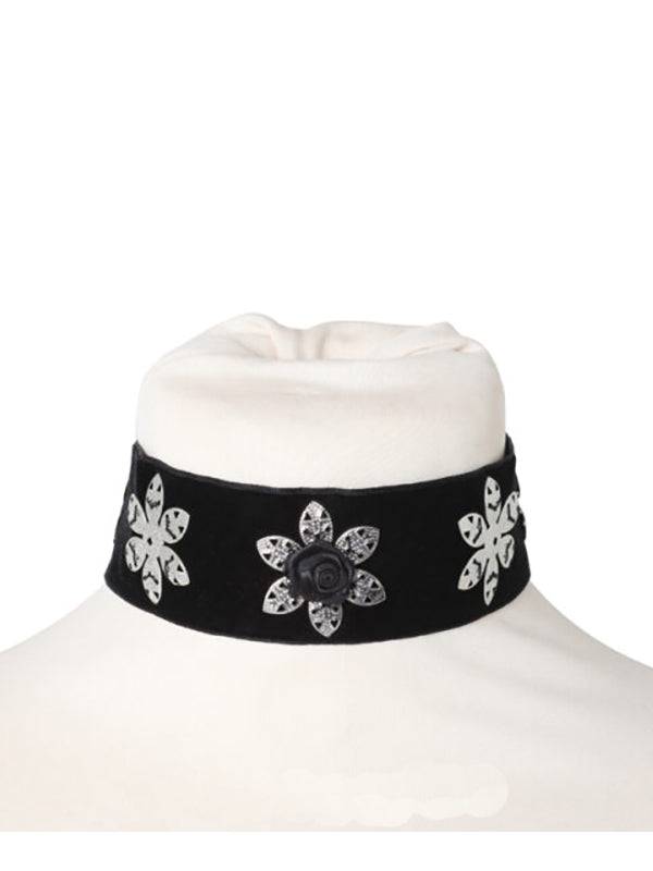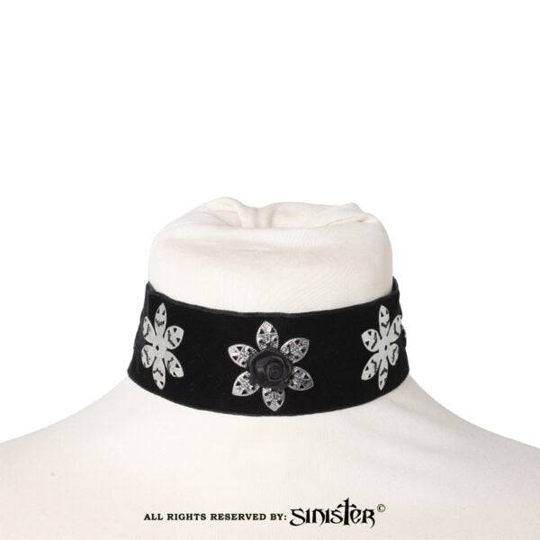 Black Velvet Choker With 5 Silver Flowers And Satin Rose – Sinister Clothing - In stock is backordered and will ship as soon as it is back in stock.