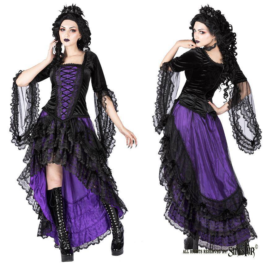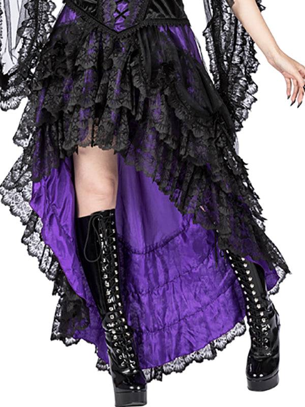 High low mullet skirt with a draped mesh overlay. The draped mesh overlay is trimmed with ruffles of black lace and black velvet ribbon and is gathered by large black velvet bows all over. The satin bottom layer of the skirt has several ruffled tiers of broad lace. Elastic waistband with concealed zipper on the side.