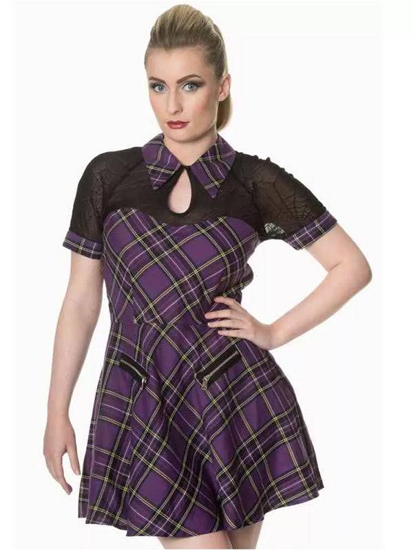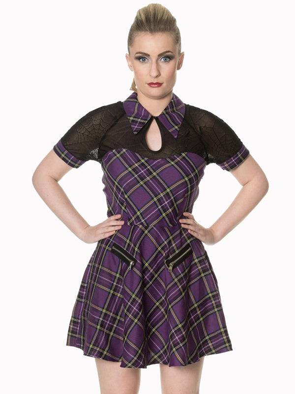 Dress made of purple tartan with spiderweb mesh and 2 zippers.