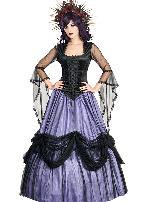 Gothic Victorian gown with square neckline and graceful, transparent black mesh sleeves decorated with lace. The black velvet top is crafted with a corset-inspired design, featuring delicate lace-up details at the center front for a flattering silhouette. The fully lined skirt is layered with rich black mesh drapery gathered by satin ribbon roses. Concealed zipper fastening at the back.